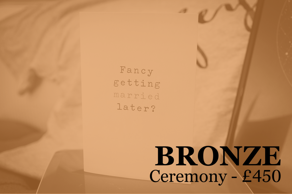 The BRONZE package covers 3 hours of photography, capturing the couple and their guests arriving at the wedding venue, full coverage of the ceremony, followed by portraits of the happy couple.
